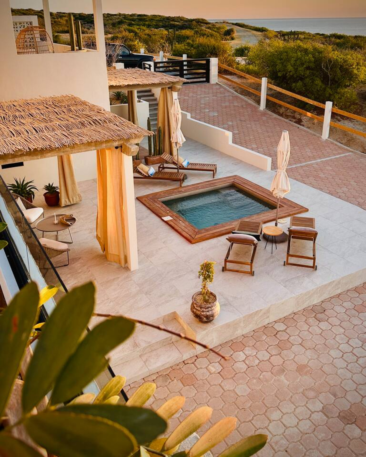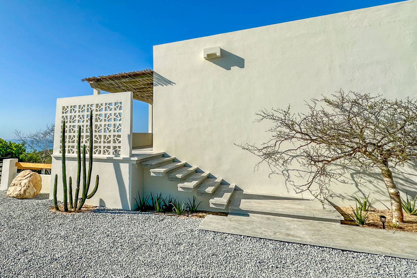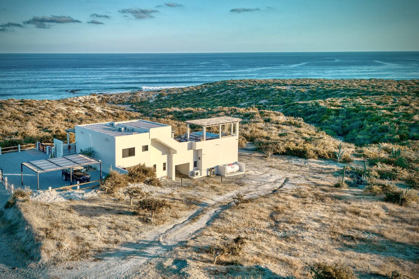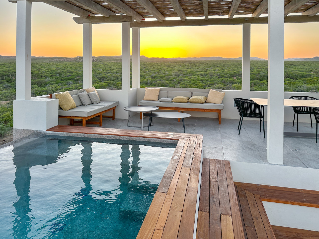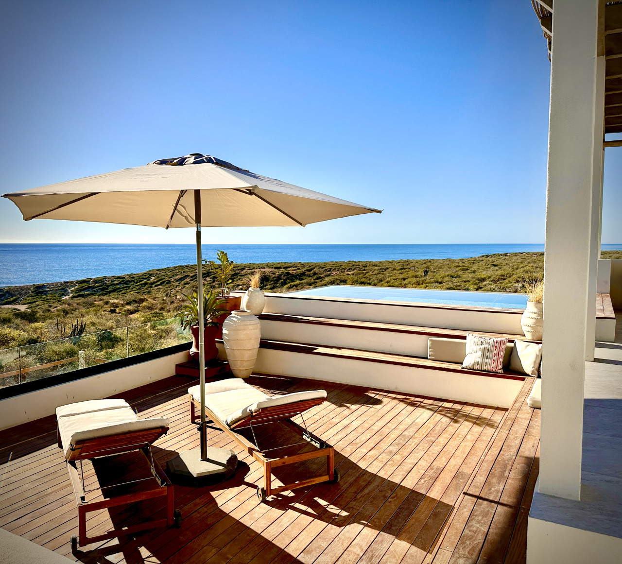 “Casa del Mar” Cabo Vinorama Casa del Mar is more than a villa — it’s your private perch above the Sea of Cortez, hidden within the gated community of Cabo Vinorama and perfectly placed halfway between San José and Cabo Pulmo. Here, the modern comforts all in a setting that feels worlds away where the desert meets the sea, and the pace of life slows to match the rhythm of the waves. Wake up with the sunrise and wander down to the endless beach for a barefoot stroll. Snorkel in the clear shallows, or paddle out to surf our local breaks, “La Poza,” or “Punta Perfecta.” Linger by the infinity pool on the yoga deck as the sea glitters in front of you, or set off to explore — from the reefs of Cabo Pulmo to the beach and restaurants of La Fortuna. Casa del mar consists oof includes four lofts, for 8 adults plus juniors, giving you nearly 2,900 sq ft of indoor living space plus multiple terraces, gardens, and shared outdoor areas: 🌅 Grand Horizon Loft (1,400 sq ft): The heart of the villa, located upstairs. A spacious gathering space with a fully equipped kitchen, a large island and dining table that doubles as a perfect workspace, a comfortable living room with panoramic ocean views and a large-screen smart TV, a king bedroom with en-suite bath and dressing area, plus two private terraces — perfect for sunrise coffee or stargazing. 🌿 Serenity Loft (580 sq ft): An inviting ground-floor retreat with a king-size bed, kitchenette with dining bar, a cozy sofa seating area, en-suite bath, and a private terrace that opens to the jacuzzi. 🌊 Driftwood Loft (460 sq ft): A serene, beach-inspired loft featuring a king bed, kitchenette, en-suite bath, and private terrace — ideal for a quiet morning coffee or sunset cocktail. 🌺 Hideaway Loft (460 sq ft): Tucked away for ultimate privacy, with two twin beds (or a king upon request), kitchenette, en-suite bath, and its own secluded terrace. Perfect for kids, teens, or friends traveling together. Throughout the villa, in every Loft: High-speed Wi-Fi and air conditioning for your comfort Large-screen smart TVs for streaming your favorite shows Full en suite bathrooms and dressing areas for privacy and convenience Step outside and experience Casa del Mar’s shared spaces: Infinity pool to cool off and take in the spectacular sea Outdoor entertainment terrace with panoramic views of the Sea of Cortez Yoga deck for sunrise or sunset practice or lounging during the day Heated jacuzzi for relaxing evenings & gazing at the stars Outdoor grill and picnic area for casual gatherings Fire pit & garden for magical nights with family and friends We can’t wait to host you! Michael Casa del Mar – Cabo Vinorama Note: Casa del Mar is 40-50 minutes from San Jose on the unpaved picturesque East Cape Coastal Road half way to Cabo Pulmo. You will know you have arrived when you see Cabo Vinorama entry gate. You will be met there and taken to the house which is inside the gated property. The beach, surfing, kiting, boarding and swimming just a 5 minute walk. You need to bring experience and equipment. Grocery shopping needs to be planned in advance. The caretaker will be there each day but Sunday. Please consult us before you arrive to clear up any doubts you may have.